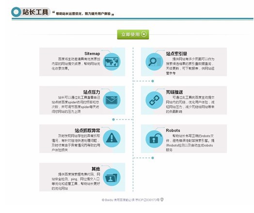 站長(zhǎng)可以通過(guò)工具區(qū)提供的死鏈推送、站點(diǎn)索引量查詢、站點(diǎn)抓取報(bào)錯(cuò)查詢、robots工具、站點(diǎn)壓力反饋和網(wǎng)站安全監(jiān)測(cè)等功能,減輕網(wǎng)站服務(wù)器壓力,提升網(wǎng)頁(yè)抓取效率和質(zhì)量,減少網(wǎng)站安全隱患,從而實(shí)現(xiàn)網(wǎng)站的精細(xì)化運(yùn)營(yíng)。資料區(qū)提供了搜索優(yōu)化案例、工具使用說(shuō)明、網(wǎng)站運(yùn)營(yíng)經(jīng)驗(yàn)文檔,幫助站長(zhǎng)汲取網(wǎng)站運(yùn)營(yíng)經(jīng)驗(yàn)、夯實(shí)理論基礎(chǔ);站長(zhǎng)社區(qū)的則是站長(zhǎng)間溝通和分享的平臺(tái),既會(huì)定期組織交流活動(dòng)和分享討論,,有利于站長(zhǎng)們?nèi)¢L(zhǎng)補(bǔ)短提升網(wǎng)站運(yùn)作技巧,解決站長(zhǎng)面臨的典型問(wèn)題。