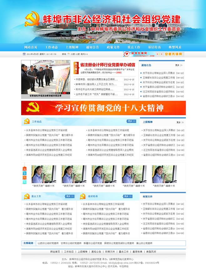 網(wǎng)頁由中共蚌埠市委非公經(jīng)濟和社會組織工作委員會,蚌埠先鋒網(wǎng)電教中心承辦,作為蚌埠先鋒網(wǎng)子欄目,主要用于蚌埠非公經(jīng)濟和社會組織黨建工作有關(guān)信息發(fā)布和經(jīng)驗交流。
